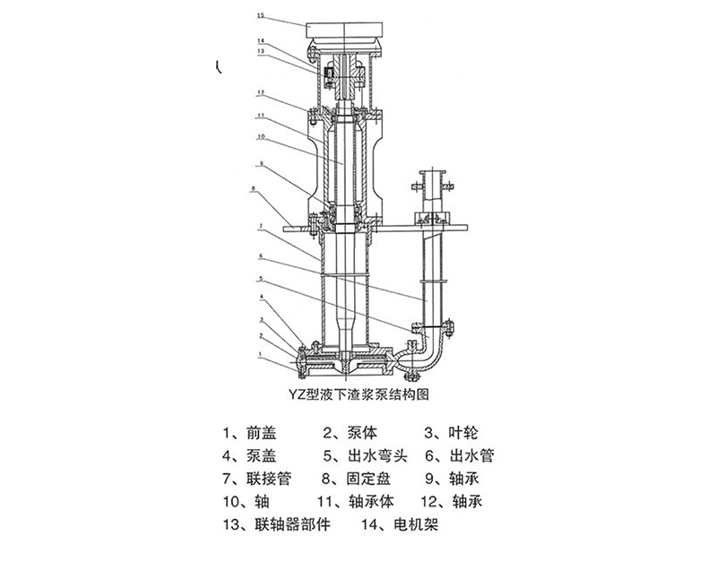 1, YZ型液下渣漿泵是立式單級(jí)單吸懸臂式離心泵結(jié)構(gòu),葉輪為半開式葉輪,在葉輪吸入邊延伸處設(shè)有攪拌葉片。